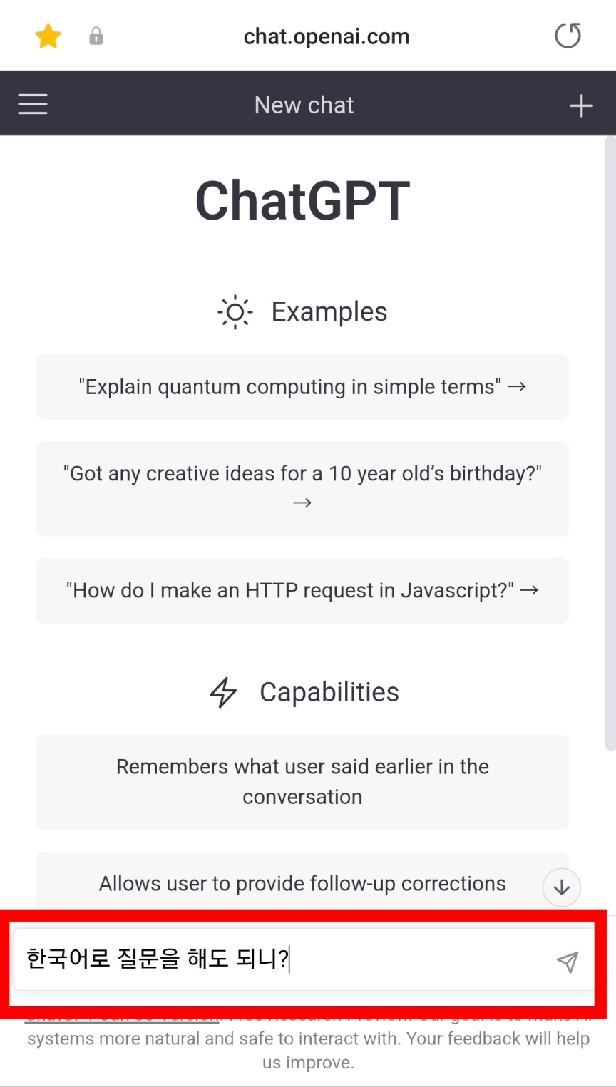 먼저 챗 GPT 사용을 위해서는 모바일 환경을 권한다. 현재는 베타버전이라 접속이 불안정하여 모바일 사용이 원활하기 때문이다. 주소는 https://chat.openai.com/chat이다. 회원가입과 로그인을 진행하고 기본적인 사용방법은 하단의 채팅창에 물어보고 싶은 질문을 하면 된다. 간단하다. 대화의 기본 언어는 영어이지만 아래와 같이 한국어 질문도 가능하다.