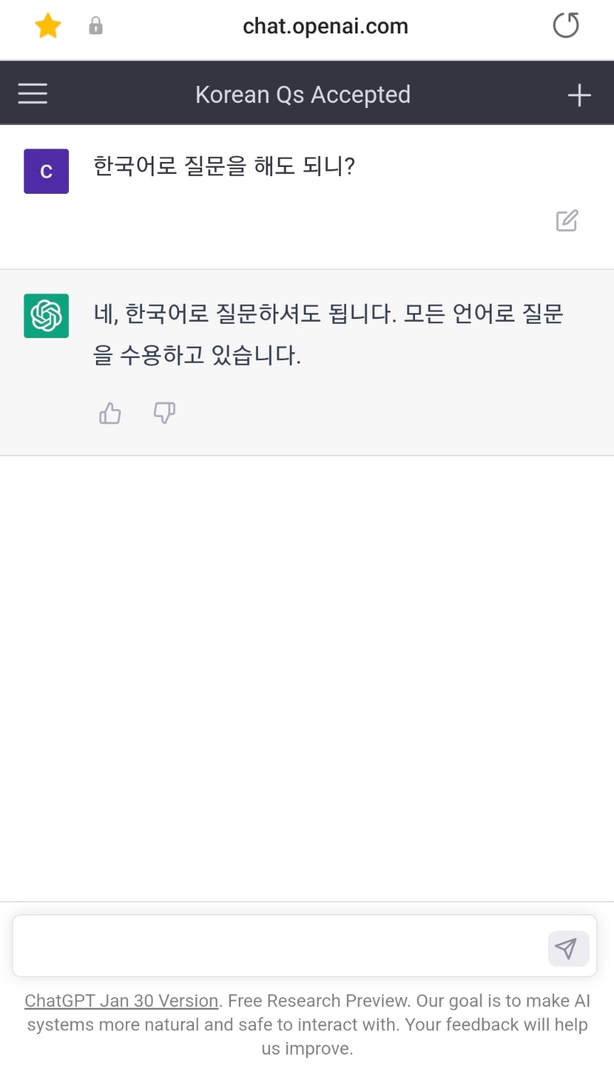 먼저 챗 GPT 사용을 위해서는 모바일 환경을 권한다. 현재는 베타버전이라 접속이 불안정하여 모바일 사용이 원활하기 때문이다. 주소는 https://chat.openai.com/chat이다. 회원가입과 로그인을 진행하고 기본적인 사용방법은 하단의 채팅창에 물어보고 싶은 질문을 하면 된다. 간단하다. 대화의 기본 언어는 영어이지만 아래와 같이 한국어 질문도 가능하다.